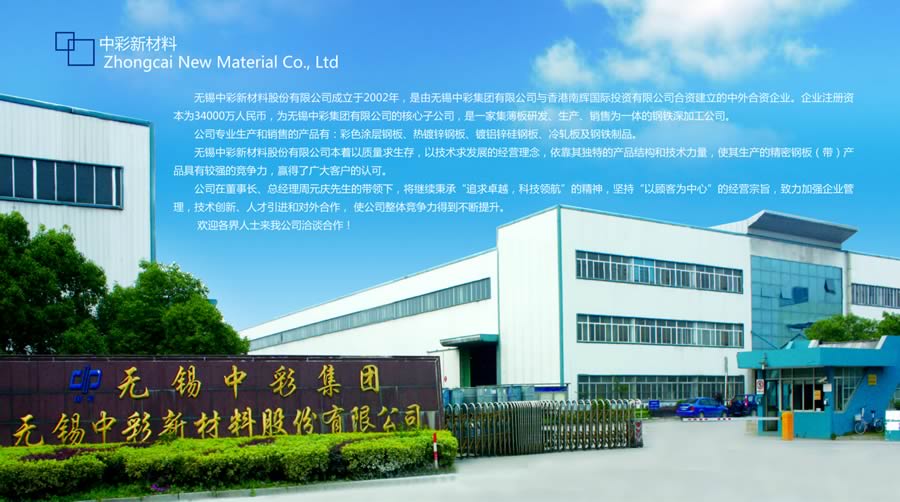 無錫中彩新材料股份有限公司(原無錫新大中鋼鐵有限公司)成立于2002年,是由無錫中彩集團有限公司與香港南輝國際投資有限公司合資建立的中外合資企業(yè)。企業(yè)注冊資本64000萬元,為無錫中彩集團有限公司的子公司, 是一家集薄板研發(fā)、生產(chǎn)、銷售為一體的鋼鐵深加工企業(yè)。 公司占地面積300余畝,資產(chǎn)規(guī)模超20億元,公司主要生產(chǎn)銷售熱鍍鋅鋼板(年產(chǎn)20萬噸)、彩鋼板(年產(chǎn)25萬噸)、鍍鋁鋅(年產(chǎn)15萬噸)、冷軋鋼板(年產(chǎn)60萬噸)、鍍錫鋼板(年產(chǎn)16萬噸)、熱浸鍍鋁鋼板(年產(chǎn)10萬噸)。 公司現(xiàn)有員工580余人,擁有大專以上學(xué)歷員工占總員工的28%以,公司擁有一個市級工程技術(shù)中心,一個省級工程技術(shù)中心,是國內(nèi)鋼鐵行業(yè)唯一一家國家級實驗中心的中試基地。 |