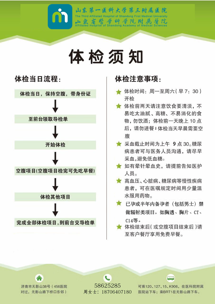 (二)體檢地點(diǎn):山東省醫(yī)學(xué)科學(xué)院附屬醫(yī)院體檢中心(位置:濟(jì)南市無影山38號(hào)(456醫(yī)院對(duì)面)1號(hào)樓查體中心);